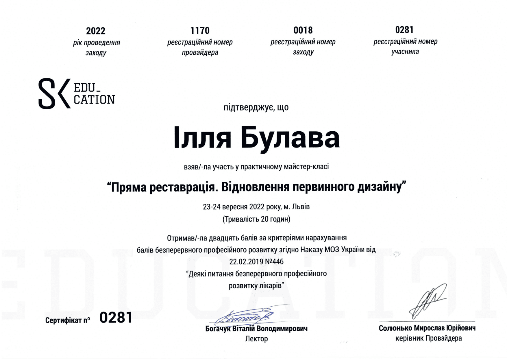 2022 — Kurs prywatny Witalija Bohaczuka „Odbudowa bezpośrednia i odtworzenie pierwotnego kształtu zęba”, Lwów