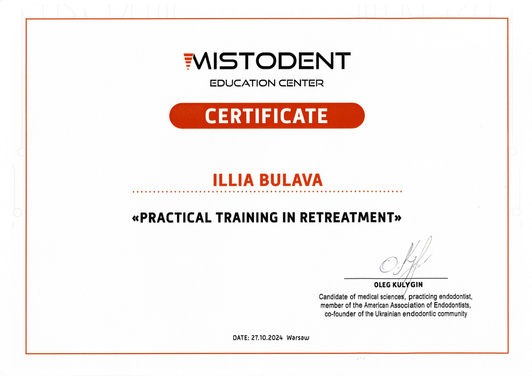 2024 — Kurs prywatny Olega Kulygina „Powtórne leczenie endodontyczne oraz usuwanie złamanych narzędzi”, Warszawa