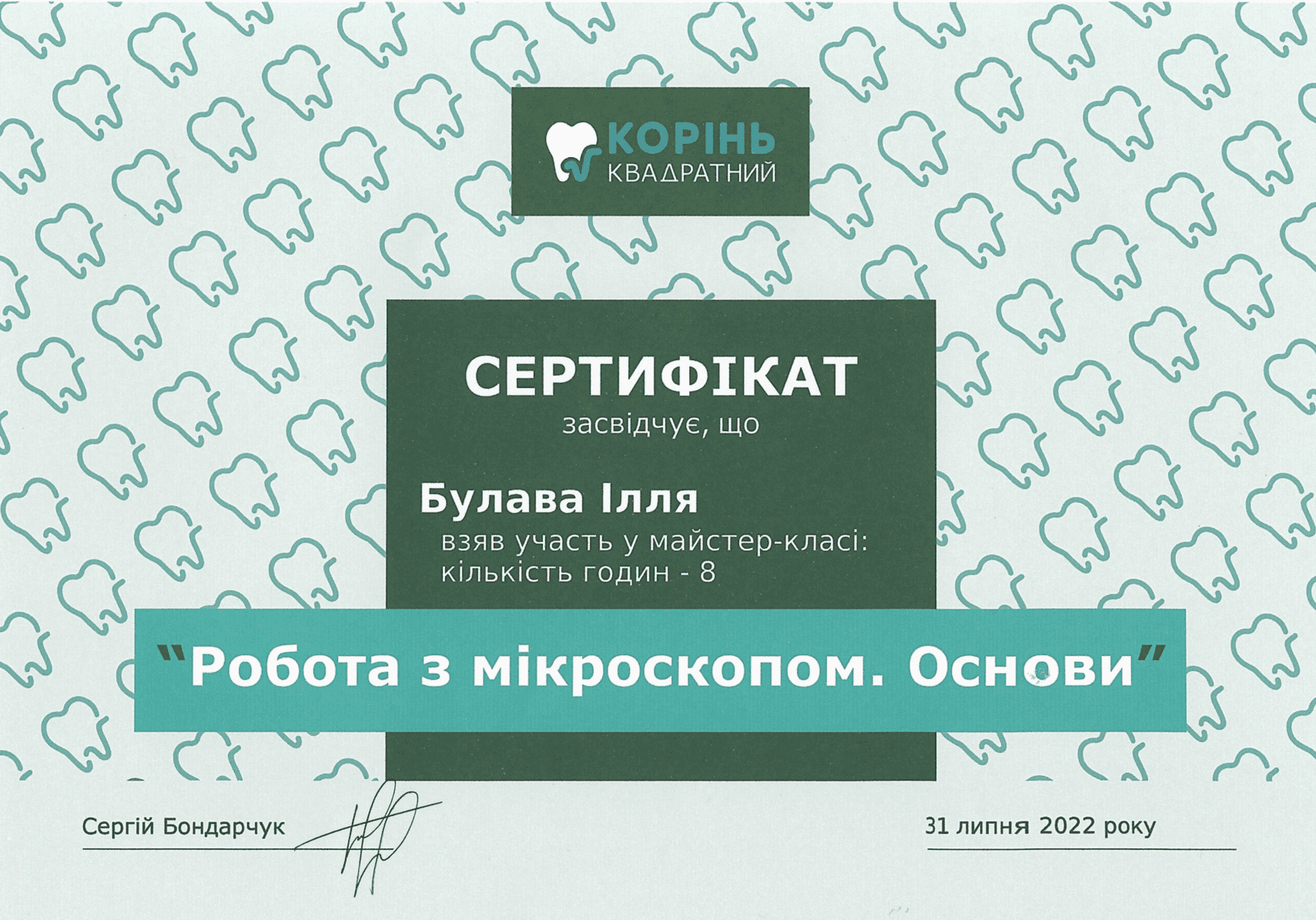 2022 — Kurs prywatny Serhija Bondarczuka „Usuwanie fragmentów złamanych narzędzi z kanałów korzeniowych, lokalizacja i opracowanie MB2”, Kijów